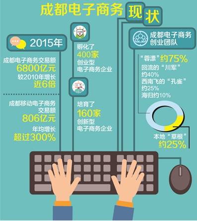 据悉,从去年我市启动“创业天府”行动计划以来,在政府的先导推动、市场的主导作用和社会各界的积极支持参与下,一批批年轻的创业者、资深的投资人云集成都,成都电子商务领域取得了长足发展。数据显示,2015年,我市实现电子商务交易额6800亿元,较2010年增长近6倍;移动电子商务交易额806亿元,年均增长超过300%,而且通过构建电子商务创新创业孵化培育机制,出台突破性支撑保障政策,打造电子商务众创空间,搭建“移动电商创客秀”“电商咖啡”等平台,成功孵化了400家创业型电子商务企业,培育了160家创新型电子商务企业。