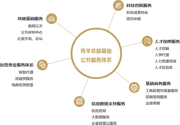 青羊总部基地将通过完善公共平台,以电子商务大厦为基础,联合80多家专业服务机构建立服务联盟、行业联网、服务网站、行业协会,以公共服务平台建设为抓手,为入驻电商企业提供信息数据支持、运营资金服务、基础商务服务、人才保障、科技创新及其他基础服务等六大类公共服务(如下图所示)。