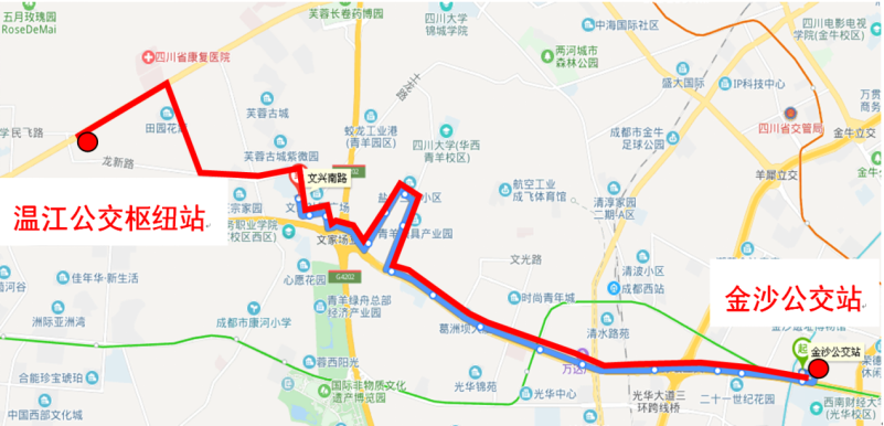 站点设置:金沙公交站、二十一世纪花园、三环路苏坡立交桥东、苏坡立交桥西、武青路口、光华北三路口、同诚路口、导航路口、文家路口、文家大道南、盐井小区、乐大公路、乐大公路南、精城花园、文家场口、文兴南路、文康路、文康路永文路口、八一路南、新庄社区、芙蓉大道八一路口、芙蓉大道万花路口、温江公交枢纽站。